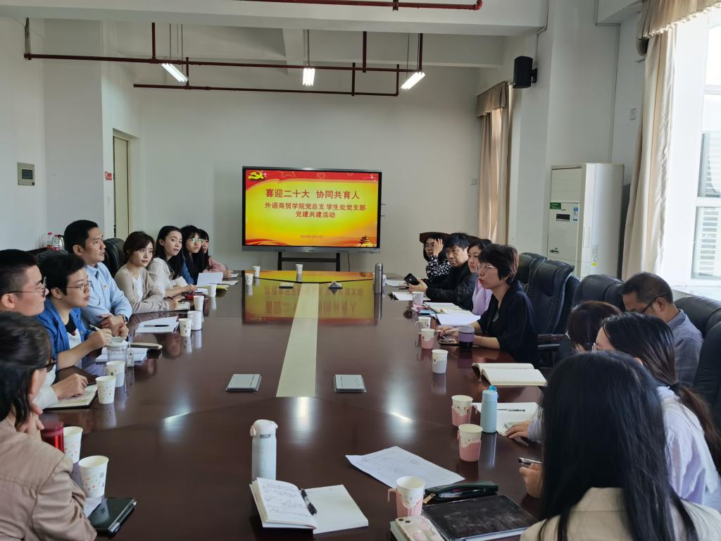 开展党建结对共建交流活动是实现基层党组织工作互动和资源共享、优势互补、提升党建水平的重要方式。10月19日上午,学生处党支部与外语商贸学院党总支于综合楼7楼第三会议室开展“献礼二十大,协同共育人”党建共建活动。外语商贸学院党总支书记林冉、学生处处长郭静静带领双方教师党员共同参与共建座谈。会议由外语商贸学院陈颖副书记主持。