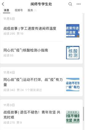 在疫情防控的特殊时期,充分利用新媒体“短、平、快”优势,学生微信公众号、视频号,易班工作站、小桔灯微信公众号等新媒体平台,及时发布疫情相关信息,深入挖掘网络育人功能,实时发布应对疫情各类工作信息,积极传播正能量,提供防疫知识科普,宣传传染病防控知识和有关法律知识,引导学生树立防控意识,科学做好疫情防控,做到不造谣、不信谣、不传谣、不恐慌,用真情促进学生健康成长。