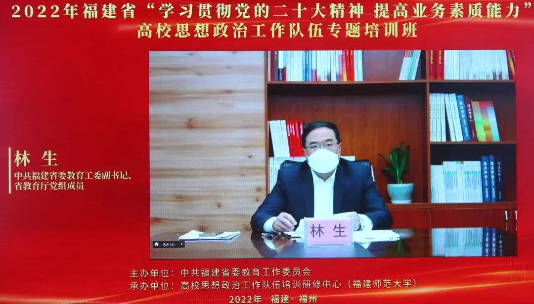 12月28日上午,由中共福建省委教育工委主办、高校思想政治工作队伍培训研修中心(福建师范大学)承办的福建省“学习贯彻党的二十大精神 提高业务素质能力”高校思想政治工作队伍专题培训班开班。省委教育工委副书记、省教育厅党组成员林生出席开班式并作动员讲话。大赢家体育app下载谢敏峰副校长、学生处、各二级学院分管学生工作领导、全体辅导员共70余人,以线上和线下相结合方式参加 。