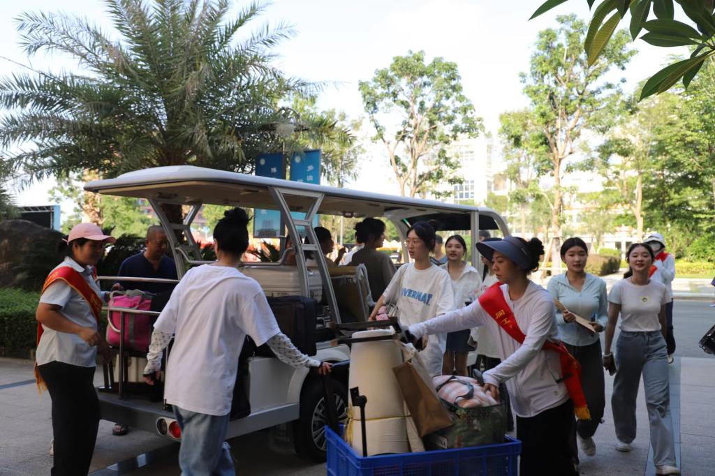 满载行囊的小白车协助志愿者搬运新生行李物品
