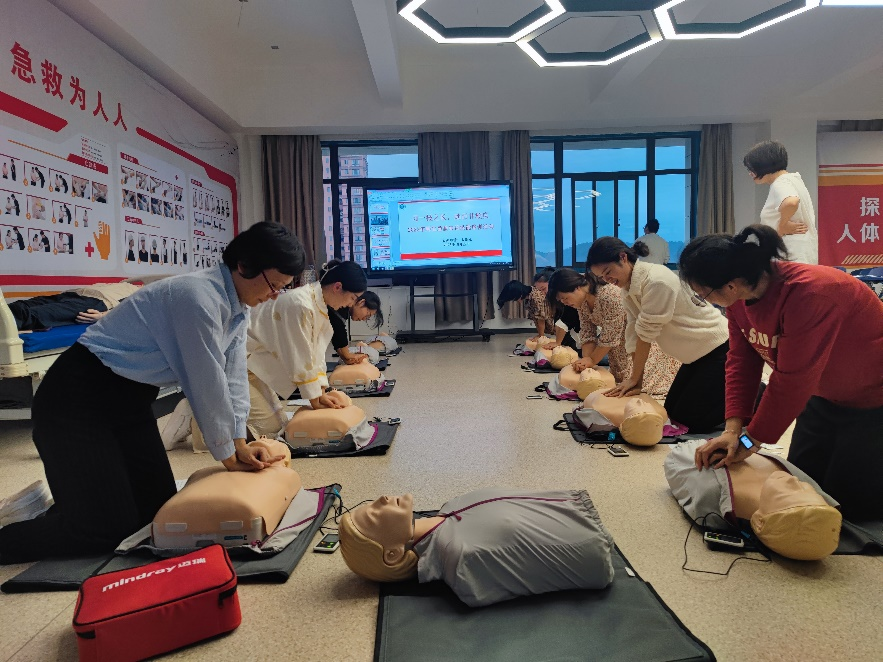 活动现场,红十字救护培训老师采取“理论+实操”的教学模式,为辅导员讲授应急救护基本知识、心肺复苏操作、创伤包扎等急救技能,并指导辅导员现场进行心肺复苏、海姆立克急救等救护技能实操训练。