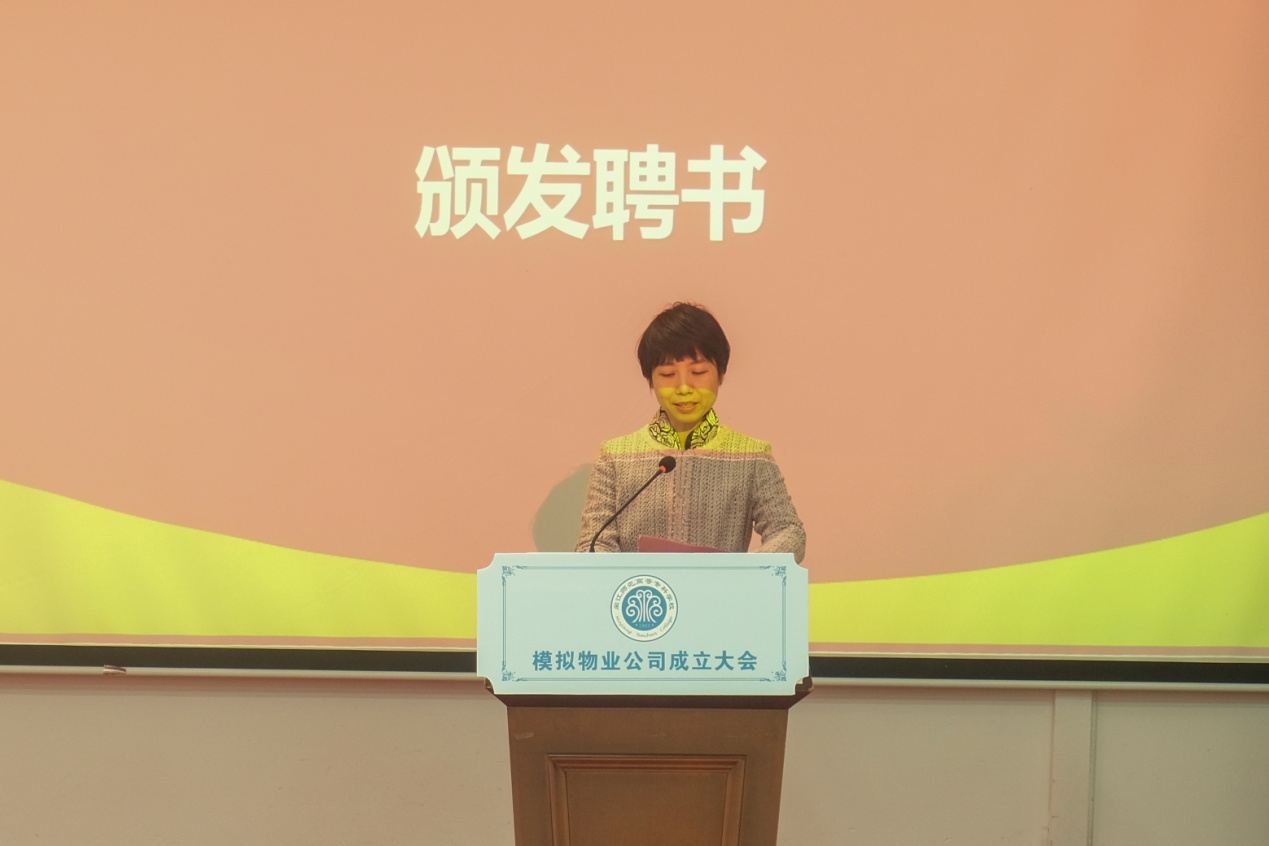 大会由校党委书记陈荣生、模拟物业公司总经理林炜奇(学生)共同为模拟物业公司揭牌,副校长刘翔炜为模拟物业公司颁发营业执照(模拟),后勤保卫处处长杨信卫、图书馆馆长董志强、学生处处长郭静静分别为模拟物业公司总经理和经理(学生)、劳动导师、创业导师发放聘书。
