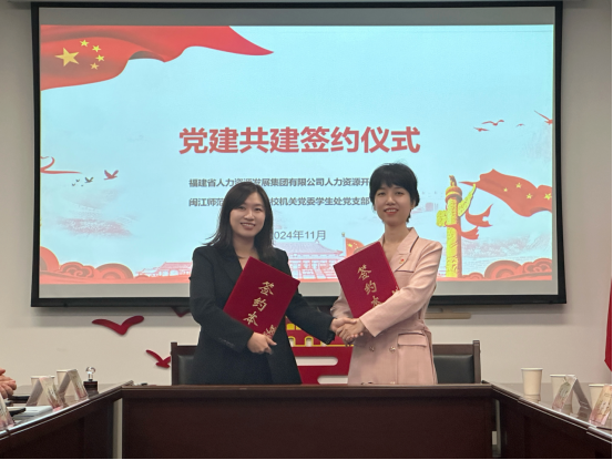 为创新基层党建工作载体,提高基层党建工作水平,2024年11月12日下午,学生处党支部与福建省人力资源发展集团有限公司人力资源开发部党支部在国资大楼开展党建共建签约活动。共建双方党员共12人参加。