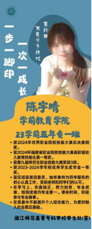 学前教育学院23学前五年专一班陈宇晴同学以“一步一脚印,一次一成长”为主题,分享了她的比赛经验和成长感悟。从最初害怕上台到积极参与技能赛,她通过不断的实践与培训,逐渐克服了紧张情绪,展现了自我。获奖后,她心怀感恩,深知这份荣誉背后凝聚了无数人的心血与汗水。她鼓励同学们保持积极心态,面对人生的挑战与机遇,共同在幼儿教育的广阔天地中绽放光彩。