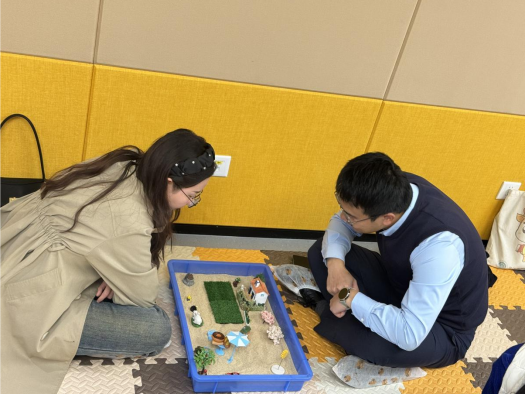 在体验环节,辅导员们亲自参与了沙游治疗的过程。王歆逸老师指导大家鼓励学生自由创作,并在创作过程中保持开放与不下定论的态度。辅导员们两两一组,分别扮演了老师和学生的角色,练习和体验沙游疗法的技术。