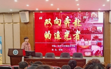 化学与生物技术学院22分析检验技术2班的张艳同学以“‘双向奔赴’的追光者”为主题,从思想政治、学习工作、技能竞赛、社会实践四个方面,深情讲述了自己的逐梦之旅。她用自己的亲身经历告诉我们:坚定前行的人,总能行稳致远;勇敢追光的人,终将光芒万丈。