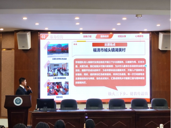 医护学院23级护理4班的刘鹏同学以 “小行动汇聚大能量” 为主题,讲述了参与社区医疗服务的感人故事。“作为医护生,我们的初心不仅是课本上的理论,更是用爱点亮他人生命的微光。” 一句肺腑之言,直击人心,赢得现场阵阵热烈掌声,也让大家看到了医护工作者的使命与担当。