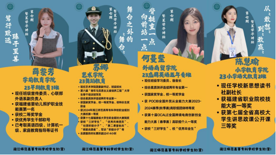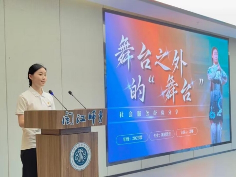 艺术学院23级舞蹈教育班苏娜同学以“舞台之外的‘舞台’”为题,分享自己各种社会服务的经历和感受。她综测稳居第一,获国家级、省级舞蹈及健身气功赛事等奖项,身兼多职锻炼能力,志愿服务时长累计四百多小时,活跃于数字中国峰会、乡村振兴演出等活动。她将舞蹈与传统文化结合,在高雅艺术进校园、养老院慰问等活动中创新表演,以“行稳致远,进而有为” 为信念,用舞蹈传递文化,以行动诠释担当,展现了艺术在社会服务中绽放的力量。
