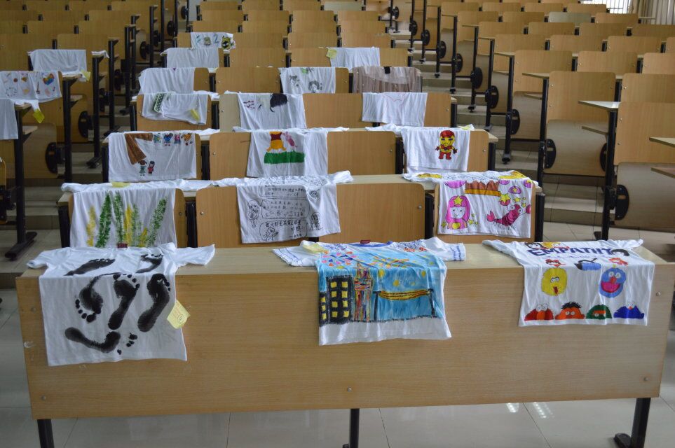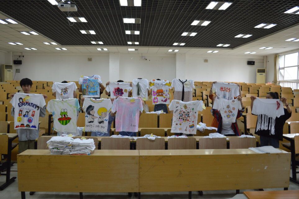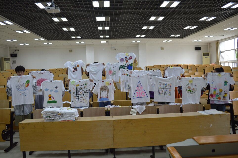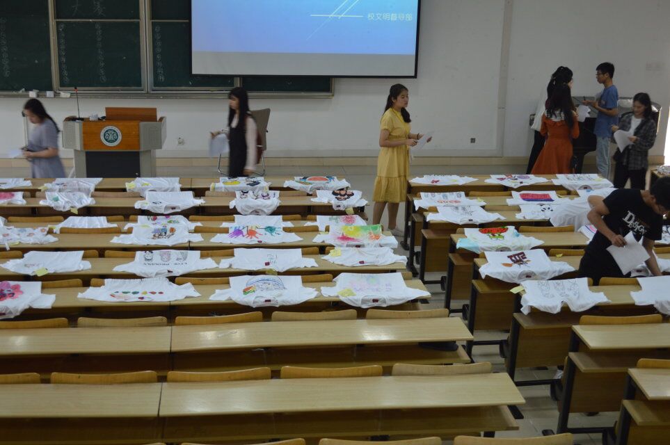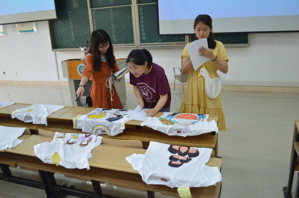 在活动现场,一件件体现出宿舍特色的舍服整齐的摆列在桌面上,参数者通过手绘、编织、裁剪等各种方式,对舍服进行创意设计,作品种类多种多样,有手绘的海绵宝宝派大星等卡通人物、有精美绝伦的绣工花卉、还有五彩缤纷的绘画图案,将原本单调的白色T恤大胆的发挥出独属于自己宿舍的风格。从这些作品中可以看出参赛者对这次比赛的尽心尽力,活动现场气氛十分活跃。在投票过程中,由学管会干部、系部部长以及各系部自律会成员组成的大众评委团秉着公平公正的原则,聚精会神的认真筛选,对作品进行投票表决,最终选出三十件优秀作品晋级决赛,并进行通知公示。