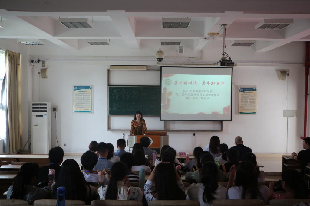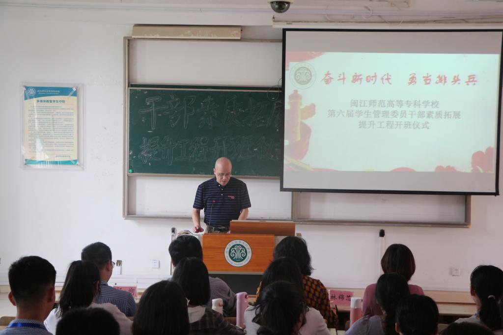 为了全面提高学生干部的综合素质,增强学生干部的工作能力,4月24日中午,大赢家体育app下载学生处在教学楼1014教室组织开展以“奋斗新时代、勇当排头兵”为主题的第六届学管会干部素质拓展提升工程开班仪式。校党委陈新副书记,学生处林锦芯、曹忆和、林育山、冯祥芳、杨朔老师,以及艺术系自律会指导老师林雅婷及第六届全体学管会、各系自律会干部出席了本次开班仪式。本次活动由学生处林育山老师主持。