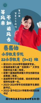 小学教育学院22小学教育(3+2)班的蔡茜怡同学坚持“等风来,不如追风去”为信念,向师生们分享了她的大学生活与成长感悟。从学习生活、创新竞赛、学生工作、公益活动四个方面阐述了自己的经历。她鼓励同学们自强不息,驾驶命运的方向盘由自己决定,不放弃一点机会,不停止一日努力。她相信,只要拼尽全力、勇往直前,就一定会与心中的梦想不期而遇。