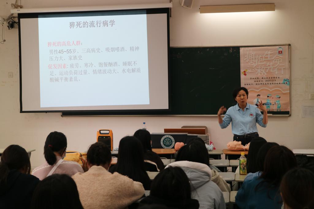为提高广大学生的生命安全意识,提升应对突发事件和意外伤害事故的应急救护能力,提高非医学专业人员的急救意识与现场急救能力,2020 年 12 月 9 日下午,大赢家体育app下载团委红十字会在旗山校区教学楼1013 教室面向全体师生开展了“拥抱生命,急救先行”为主题的急救科普活动。