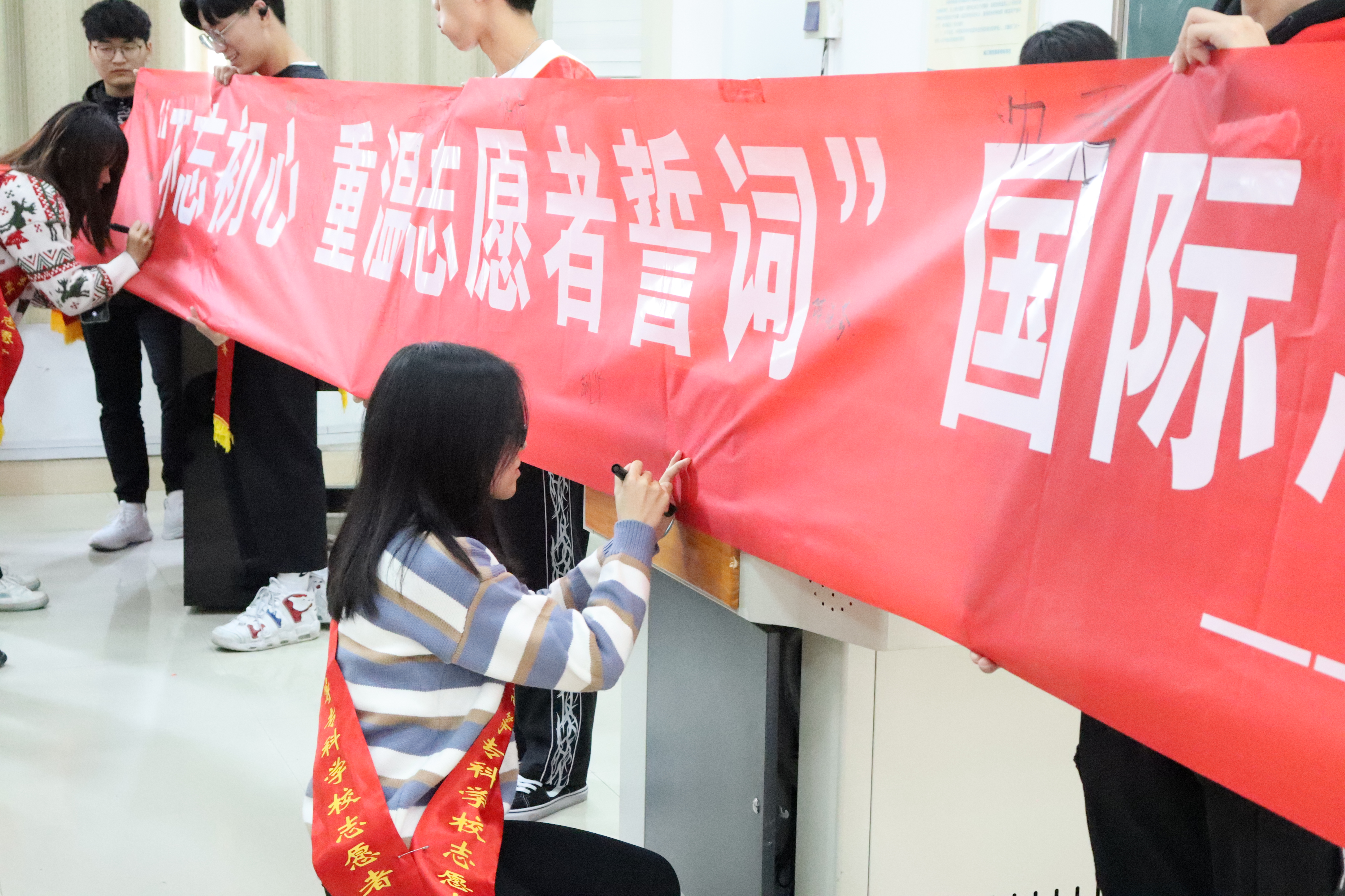 中午12点,活动正式开始,青协志愿者协会成员通过展示往期志愿活动的图片及视频,回顾往昔风采,并由青年志愿者协会会长廖武钦带领全体志愿者们重温志愿者誓词。随后,在中国青年志愿者之歌的歌声中,全体志愿者们在横幅上签名。活动结束后,志愿者们拍摄了集体合照。