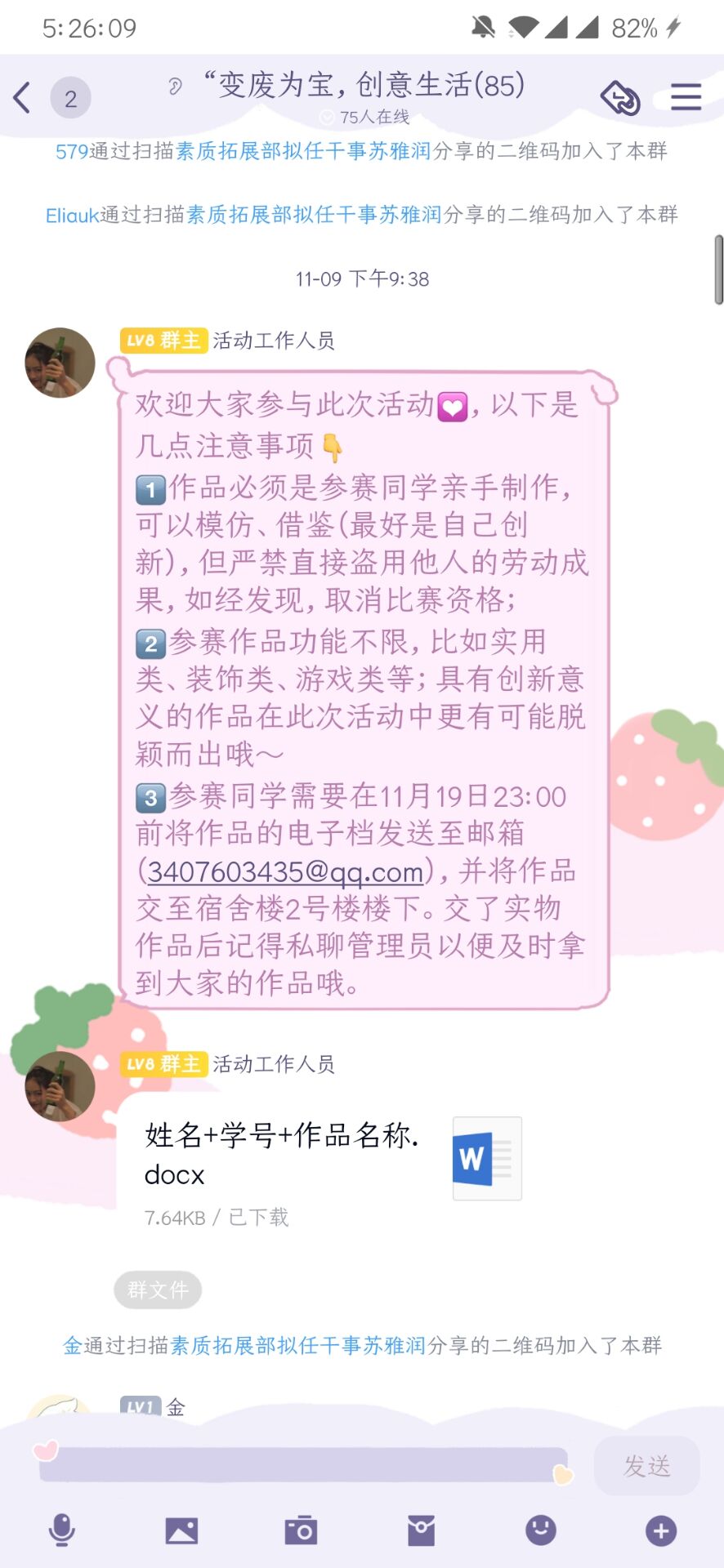 活动开始,校团委将该活动发布到班群,QQ空间和微信公众号。本次活动以线上线下相结合的形式,由参赛同学进行手工制作,把身边不用的东西变废为宝,增强资源的循环利用;参赛同学需要在规定时间内提交作品的设计理念与电子照片,让工作人员了解该作品的创作想法,最后由评委进行评选,对参赛作品进行评奖,。