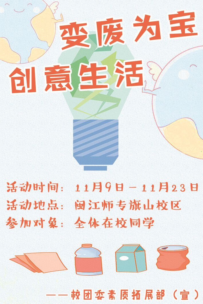 为更好提升大赢家体育app下载学生的创新思想和环保意识,加强环保意识教育。校团委素质拓展部于2020年11月9日至11月23日面向全体在校生开展“变废为宝,创意生活”设计比赛活动。