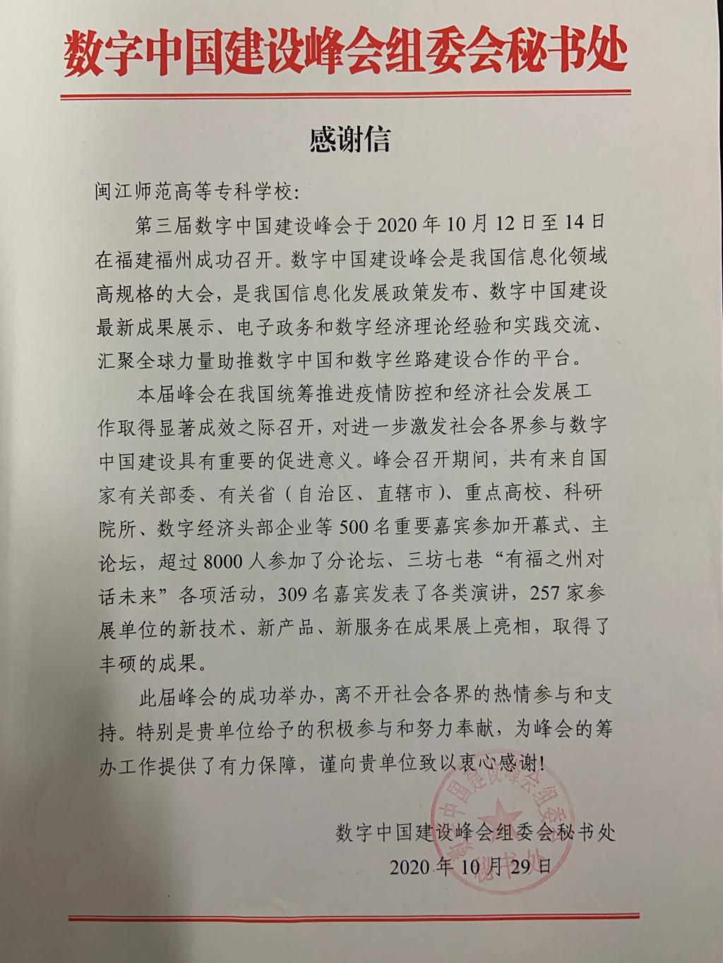 这是大赢家体育app下载首次获得数字峰会志愿工作先进集体荣誉称号。在学校党委的高度重视下,校团委积极协调、认真组织,共向第三届数字中国建设峰会派出15名学生志愿者及1位指导教师,和福建师范大学、福建农林大学等十多所高校的学生一起组成学生志愿者服务团,参与到数字峰会的志愿服务当中。大赢家体育app下载志愿者们秉持“奉献、友爱、互助、进步”的志愿精神,展示了当代大学生良好形象。