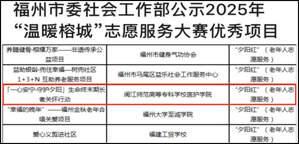 喜讯传来!在近期结束的2025年福州市“温暖榕城”新时代志愿服务项目大赛中,医护学院申报的 [一心安宁·守护夕阳]生命终末期长者关怀行动项目,成功获评 “优秀项目奖”。