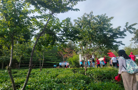 接着,队员们来到了东平镇凤林生态茶园。大家走进茶园,被满眼翠绿和清新茶香所吸引。讲解员详细介绍了茶园的运营模式和未来发展规划,体验茶园健康休闲、生态观光、采摘体验等丰富业态。跟随习近平总书记的步伐,学习习近平总书记2001年7月3日考察茶园时的重要讲话:“一片叶子富了一方百姓”,如今,茶产业已成为该村农民脱贫致富的重要依托,通过对茶产业的不断革新,凤林生态茶园的产量与种植面积不断扩大。福州大学马克思主义学院党委书记黄发友为大家开展了一堂生动有趣的“茶园里的思政课”,他表示,中国是茶的故乡,从古代丝绸之路、茶马古道、茶船古道,到今天丝绸之路经济带、21世纪海上丝绸之路,茶穿越历史、跨越国界,深受世界各国人民喜爱。而东平镇茶文化产业的发展,无疑是对习近平总书记“绿水青山就是金山银山”这一理念的绝佳阐释。队员们也纷纷表示应扎根专业领域,将所学知识与茶产业发展相融合,保持赤子之心,跟随领袖足迹,助力乡村振兴。