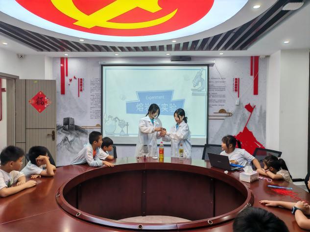 实践队还前往福清市祥兴社区,为社区的孩子们开展了一堂生动有趣的化学小课堂。通过生动讲解与互动,让孩子们了解日常化学知识,培养观察力和知识运用能力。其中, 队员们 在现场演示了两个小实验—— “ 红绿灯 ” 与 “ 熔岩灯 ” 。这两个充满趣味的化学实验吸引了小朋友们的目光,充分激发了他们的科学兴趣和跨学科思维。
