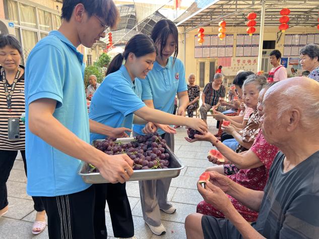 “爱满童心,情暖夕阳”社会实践队前往福清市乡镇展开一系列社会实践活动。 他们 抵达新侨兴养老院,为长者们送去夏日清凉,西瓜、葡萄与冰淇淋等消暑佳品受到老人们的热烈欢迎。队员们与老人们围坐畅聊,聆听他们讲述往昔岁月 ; 与老人们共看电视,细心询问健康状况和日常生活 ; 与老人们共同录制祝福视频,祈愿健康长寿,生活充满快乐 。整个 场面温馨感人 , 为老人们带去心灵慰藉。 此外, 实践队带着慰问物资 看望 渐冻症青年,听她回忆校园时光,传递温情与 关爱 。
