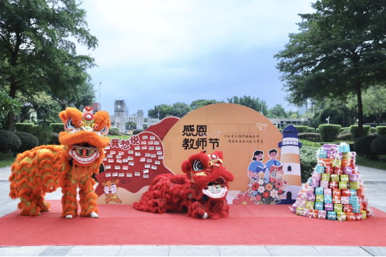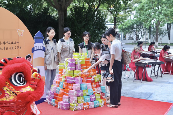 活动当日,校团委学生会学生干部们将精心准备的教师节盲盒巧妙地堆叠成一座座小巧玲珑的“盲盒塔”,造型别致,引人注目。教师们在忙碌的工作间隙,纷纷驻足挑选心仪的盲盒,脸上洋溢着惊喜的笑容。与此同时,艺术学院学生志愿者们现场演奏古筝,悠扬婉转的琴声为活动增添了典雅的文化气息;舞狮社团的学生志愿者们则身着色彩鲜艳的舞狮服饰,乖巧地坐在一旁,萌态十足,引得不少教师们驻足合影。