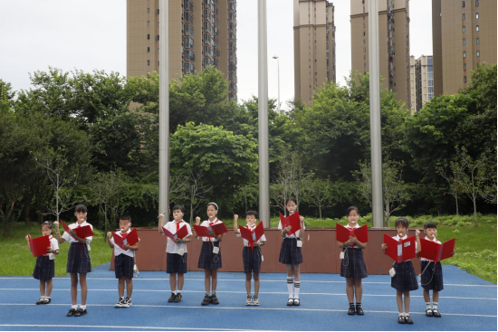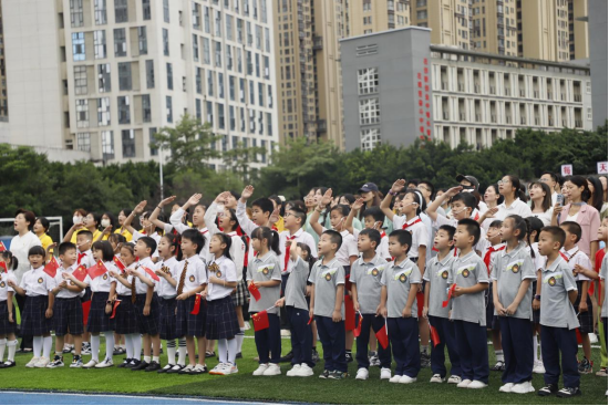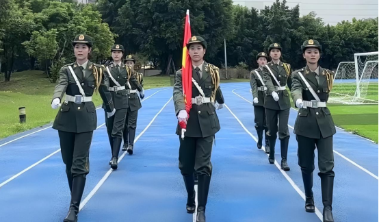伴着清晨的朝阳,升国旗仪式正式开始。学校国旗护卫队迈着铿锵有力的整齐步伐,口号嘹亮,护送鲜艳的五星红旗进场。随着激昂的国歌响起,全场师生以庄严的姿态肃立,齐声高唱国歌,目光紧随五星红旗缓缓升起,共同见证这一庄严而神圣的时刻。