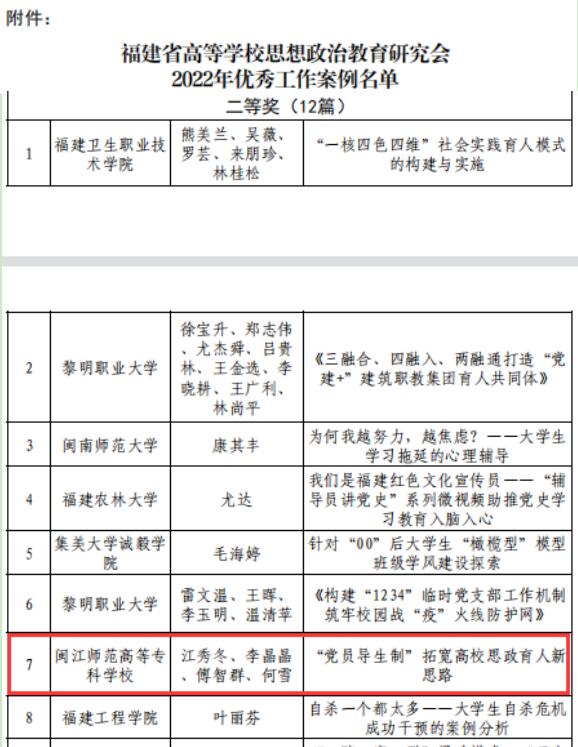 近日,福建省高等学校思想政治教育研究会公布了2022年优秀工作案例名单(闽高思研〔2023〕2号),我院思政队伍江秀冬、李晶晶、傅智群、何雪等4名教师撰写的案例《“党员导生制”拓宽高校思政育人新思路》荣获二等奖。
