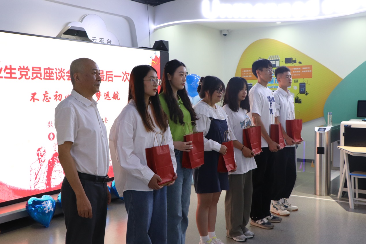 离校临别之际,在陈欣书记的带领下,与会师生党员重温入党誓词,激励师生党员不忘初心、牢记使命,接续奋斗。活动最后,陈欣书记一一为毕业生党员赠送了毕业“行囊”,一枚党徽、一本《中国共产党章程》、一本红书,送上沉甸甸的“行囊”为毕业生党员“壮行”。