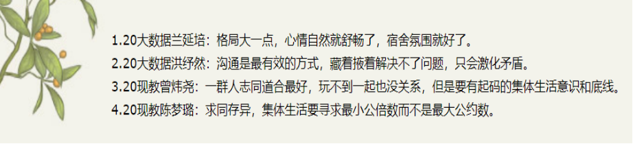 本次活动旨在倡导同学们要有一颗包容的心,接纳彼此的不足和缺点,感恩彼此的爱和陪伴。首先发动21级、22级各宿舍开展了“真心话大冒险”趣味小游戏,引导宿舍成员说出对宿舍的真实评价和意见以及宿舍成员的优缺点。接下来在宿舍成员的共同探讨下,制定一份舍规,并粘贴在宿舍明显的地方。最后发动20级的学长学姐给学弟学妹们在宿舍相处方面提出一些小建议。本次活动共收到了20多条建议,总结起来有三点。第一点是要学会沟通,及时化解矛盾;第二是要尊重别人的习惯,积极主动关心别人;第三是制定宿舍规则,自觉遵守宿舍规定。