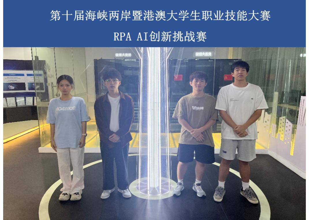 由福建省教育厅、省人力资源和社会保障厅、省互联网信息办公室等主办的第十届海峡两岸暨港澳大学生职业技能大赛RPA+AI创新挑战赛于11月4日在福建水利电力职业技术学院开赛。由大赢家体育app下载数字信息工程学院李彬雅、李翔宇两位老师指导,官文琪、许彤、高海林、冯坤义四位同学组成的参赛团队获得团体第二名。