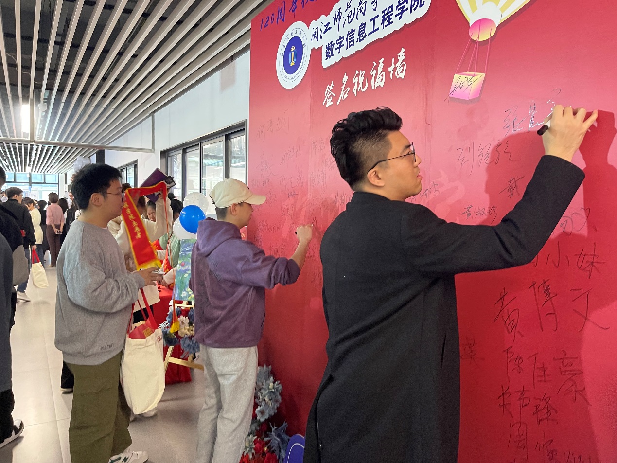 上午九时许,返校的校友陆续到达,与老友相见畅聊,在志愿者引导下游览了母校,让大家亲身感受母校的发展历程和校园文化。看着变化良多的学校,校友纷纷留下了饱含期望的寄语。九点半,在学校大礼堂举办建校120周年教学成果汇报演出,数万名海内外校友和师生员工欢聚一堂,共同见证闽江师专光荣与梦想交汇的美好时刻,因故不能返校的校友也通过直播观看演出。演出结束后,数信学院各级校友在旗山产创楼106教室、仓山2-305教师开展了学院座谈交流,时隔多年的师生、老友重聚,回忆当年的点点滴滴,为学院的进步发展点赞,畅想未来,欢声笑语,气氛热烈。