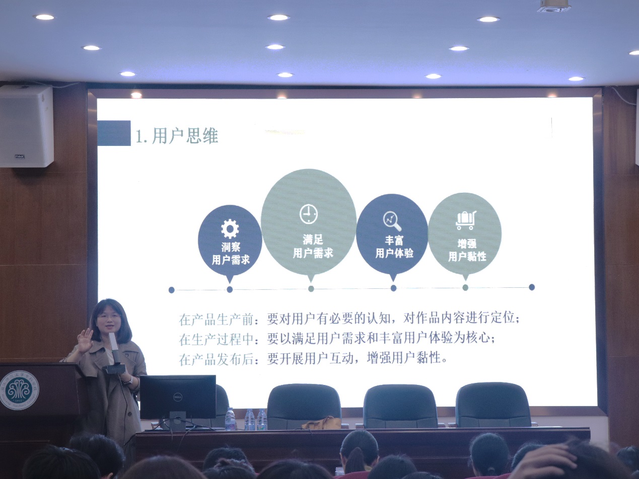 授课中,施蕾博士从媒体时代意味着什么、新媒体作品创作思维、新媒体作品制作技巧、短视频创作指南四个模块展开,结合大量优秀新媒体作品,用幽默风趣、通俗易懂的话语向在座师生讲解新媒体作品的特点、创作要领,系统全面总结了新媒体作品创作规律。施蕾博士还就新媒体运营团队培养管理、选题策划机制等与师生交流,为我院宣传工作提质增效指明方向。