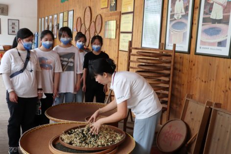 7月1日上午,两支团队走进福州市党性教育实践基地——茉莉花文化基地,参观了福建春伦集团党建展厅,深入了解茉莉花朴实无华、不张不扬的精神与内涵,零距离欣赏了茉莉花茶制作老师现场演示的平、抖、蹚、拜、烘、窨、提等福州茉莉花茶传统窨制手工技艺,并在基地老师指导下现场体验。