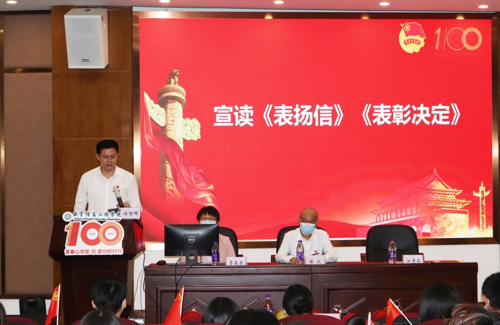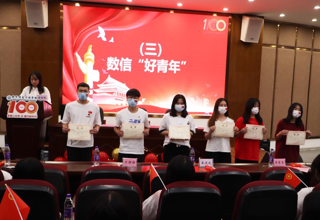 高举团旗跟党走,青春筑梦显担当。为迎接党的二十大胜利召开,纪念中国共产主义青年团建团一百周年,传承“五四”精神,激励团组织和团员、团干部比学赶超,充分发挥学生先进典型示范作用,5月4日晚,数字信息工程学院在仓山校区学术报告厅组织开展了“五四”评优表彰大会。学院党总支陈欣书记、党总支青年委员、学生党支部书记、院团委书记、全体辅导员及获奖学生代表、学生组织主席团成员、团委各部门学生干部、20级、21级团员代表在现场参加了大会,其他师生在教室或宿舍通过视频直播同步收看了评优表彰大会。大会由学院团委书记傅智群老师主持。