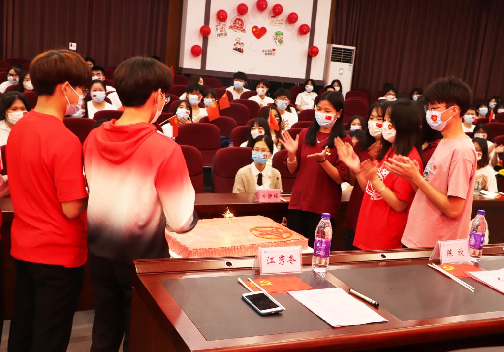 大会在雄壮的国歌声中拉开序幕。大会第一阶段,学院精心制作的《献礼“五四”,致敬青春》短视频展示了数信青年青春风采,也表达了对祖国的美好祝福以及对未来的欣然向往。大会中,陈欣书记首先向“锦鲤”青年突击队授旗,仪式庄严肃穆,使突击队员们肩上多了一份责任和担当。随后,院团委副书记蔡晓聪同学带领9名新团员和现场同学向团旗庄严宣誓,践行青春誓言。宣誓过后,青年学生带来《我们都是追梦人》快闪活动和祝福共青团100周岁生日活动将本次大会推向了高潮。