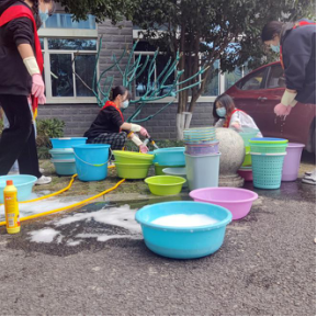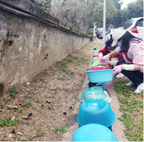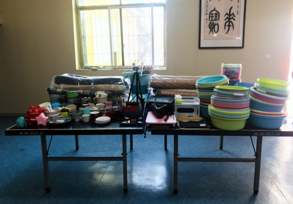 学生志愿者对捐赠用品进行清洁、晾晒、消毒