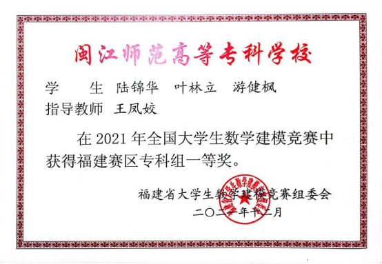 据悉,数学建模大赛于每年9月中旬举行,封闭比赛,时长为三天三夜。在学校和系部领导的鼓励支持下,今年6月份开始选拔,历经暑假两个月的磨练、专训,通过层层考验,我系共选派3支队伍参赛。经过努力拼搏,取得成绩,其中王凤姣老师指导的赛队(成员:陆锦华、叶林立、游健枫)荣获省级一等奖,实现零的突破,希望我系师生再接再厉,敢于迎接挑战,取得更多更好的成绩。
