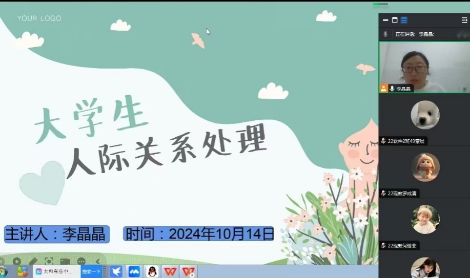 2024年10月14日,数字信息工程学院通过线上和线下相结合的形式为2025届毕业生开展了以“大学生人际交往困难怎么办”为主题的讲座。本次培训由辅导员李晶晶主讲,2025届毕业生全体宿舍长以及其他学生代表共计100余人参加。