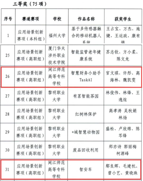 在2023年福建省大学生人工智能创意赛中,由物联网技术教研室朱发财、管定铕两位老师指导的作品《鸿蒙之家-基于RK2206的智慧小屋控制系统》获得开源鸿蒙开发者赛项(高职组)一等奖;由大数据技术教研室李彬雅、李翔宇两位老师指导的作品《智慧财务小助手TaskAI》获得应用场景创新赛项(高职组)三等奖;由现代教育技术教研室王凤姣、谢金池两位老师指导的作品《智安车》获得应用场景创新赛项(高职组)三等奖。