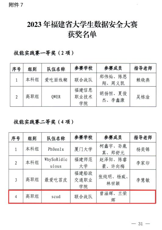 在2023年福建省大学生数据安全大赛中,我院21级信息安全技术应用专业学生曾涵辉与其他高校学生组成的联合战队获得技能实践赛(高职组)二等奖,由信息安全技术教研室褚野老师指导的逐星队获得技能实践赛(高职组)三等奖。