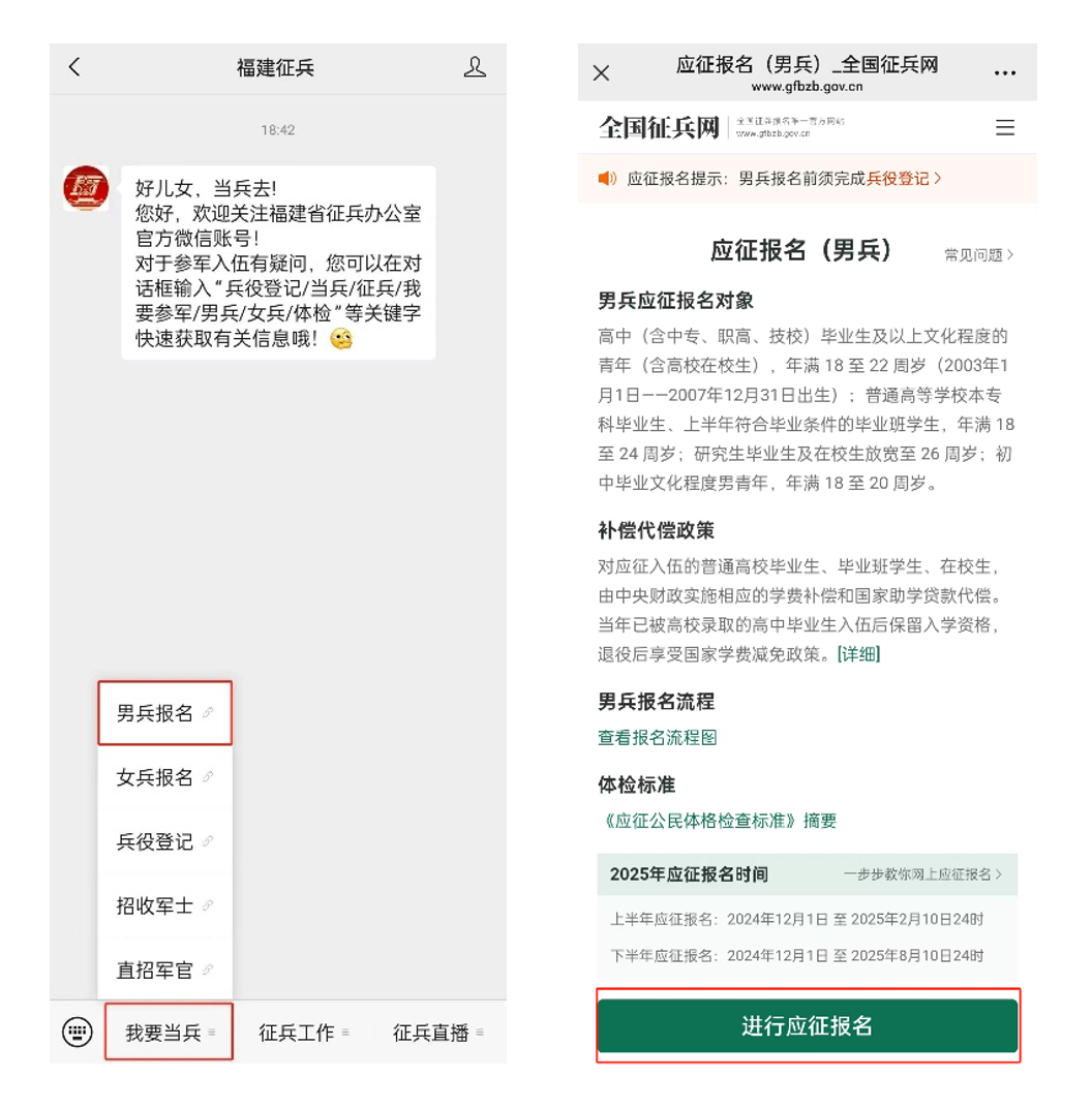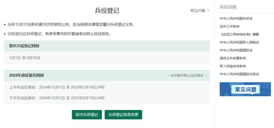 2025年全国征兵网网上登记报名于2024年12月1日开始。全国广大适龄男青年可登录全国征兵网进行兵役登记和应征报名,之后根据兵役机关安排进行实地初审初检。