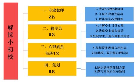 “解忧小初栈”组织结构多元,人员配备丰富。站内成员共48人,其中教育教研室的两位心理学教师王芳、张一鸣为小初栈主要指导老师,另有辅导员8 人、心理委员每班1人、小初栈策划部成员8人。