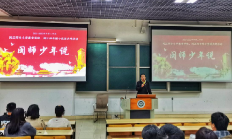 “闽师少年说”是我院与闽江师专附属实验小学党员教师、少先队大队委学生干部合作开展的党团共建系列活动,主要以项目式学习的方法,引导少先队大队委学生干部们以全面的、辩证的眼光看待问题,在他们的心灵里埋下真善美的种子,帮助他们扣好人生“第一粒扣子”。主持人刘松洋同学也分享到:作为一名新时代大学生,要在实践中牢固树立四个“正确认识”,在实践中关注时事、拓展视野,提高从政治上看问题的能力,在大是大非面前保持政治清醒。