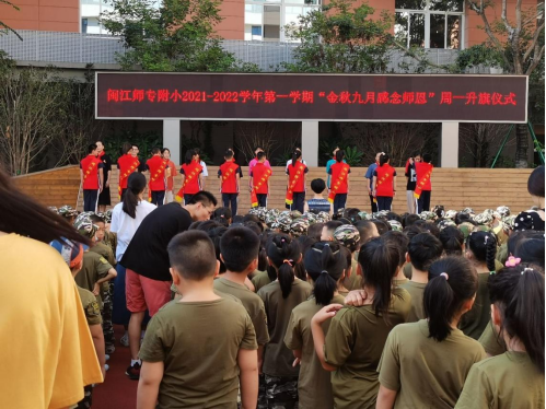 在闽江师专附实小新学期“金秋九月感念师恩”周一升旗仪式上,由陈淑华书记带领的闽师专九名新生代表上台,接受少先队员敬献红领巾,并参加随后的升国旗仪式。附实小林璐璐老师发表了《金秋九月,感念师恩》的国旗下讲话,用热情、诚恳的演讲,启迪并激发师范生的教育情怀。