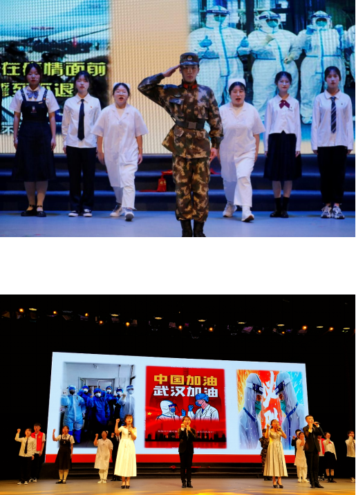 演出中,伴随着习近平总书记的讲话,同学们渐渐被带进2020年抗疫斗争中。悠扬而低沉的音乐慢慢跟进,跟随着主诵的声音,疫情的突如其来与危急展现在大家面前。前方是疫情,更是医护人员逆行而上,奋战前线的身影。我们仿佛看见医护人员的亲属满行的热泪与满怀的期盼,听见武汉震动、中国震动、世界震动!铿锵有力的朗诵声让我们感受到抗疫白衣天使们在与病魔搏斗、与死神抢人的生死时速。这时,“我是人民子弟兵!我是来自福建的护士!我是大学生支志愿者……”各行各业的人们都纷纷挺身而出,在危难之际,在生死关头,为人民群众筑起了一道坚实的生命保卫墙。当听到护士和未婚夫隔着疫区玻璃门饱含着深情的告白,当听到到工作到深夜的医护人员与母亲的电话……我们早已泪流满面。随着音乐的变化,鲜红的“中国”二字展现在舞台,大家一起高声呐喊——“让伟大的中国梦旭日东升!让伟大的中国梦旭日东升!”其震撼人心的力量,赢得了全场师生热烈的掌声。