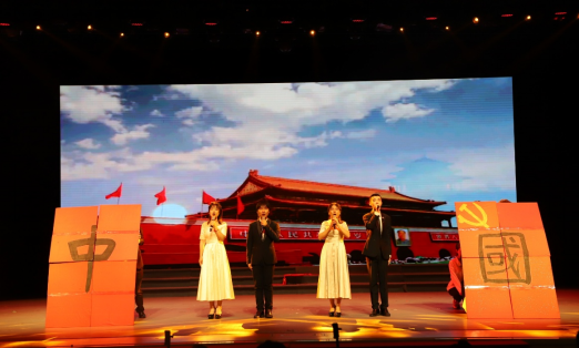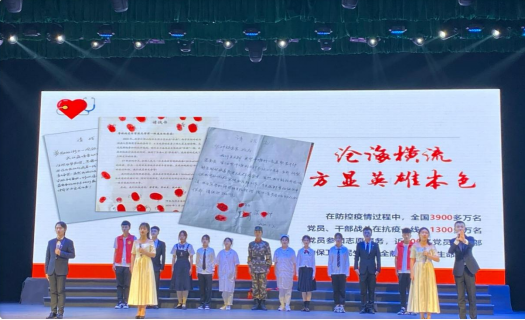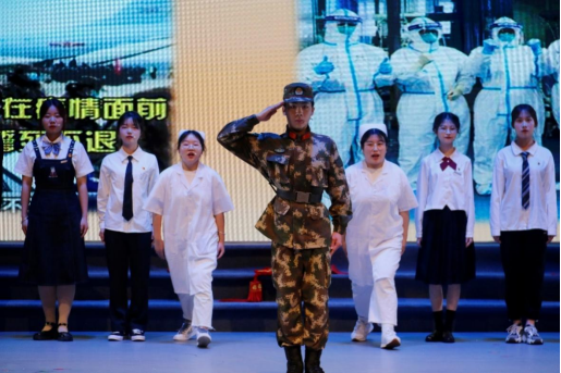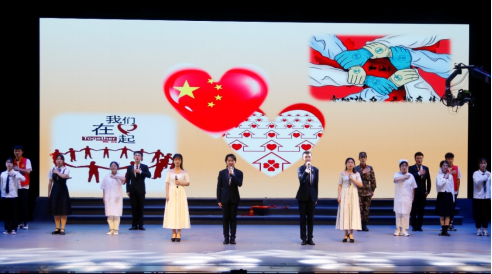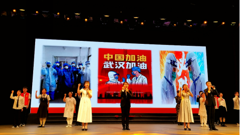 演出中,伴随着习近平总书记的讲话,同学们渐渐被带进2020年抗疫斗争中。悠扬而低沉的音乐慢慢跟进,跟随着主诵的声音,疫情的突如其来与危急展现在大家面前。前方是疫情,更是医护人员逆行而上,奋战前线的身影。我们仿佛看见医护人员的亲属满行的热泪与满怀的期盼,听见武汉震动、中国震动、世界震动!铿锵有力的朗诵声让我们感受到抗疫白衣天使们在与病魔搏斗、与死神抢人的生死时速。这时,“我是人民子弟兵!我是来自福建的护士!我是大学生支志愿者……”各行各业的人们都纷纷挺身而出,在危难之际,在生死关头,为人民群众筑起了一道坚实的生命保卫墙。当听到护士和未婚夫隔着疫区玻璃门饱含着深情的告白,当听到到工作到深夜的医护人员与母亲的电话……我们早已泪流满面。随着音乐的变化,鲜红的“中国”二字展现在舞台,大家一起高声呐喊——“让伟大的中国梦旭日东升!让伟大的中国梦旭日东升!”其震撼人心的力量,赢得了全场师生热烈的掌声。