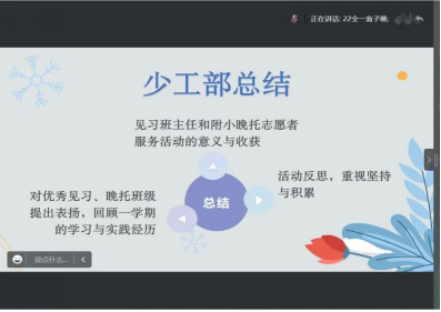 会议第三项议程,由团委少工部干事翁子琳宣读优秀的见习班级与晚托班级,并总结本学期活动过程中的不足之处,争取在下学期更加出色地完成见习班主任活动与附小晚托服务。