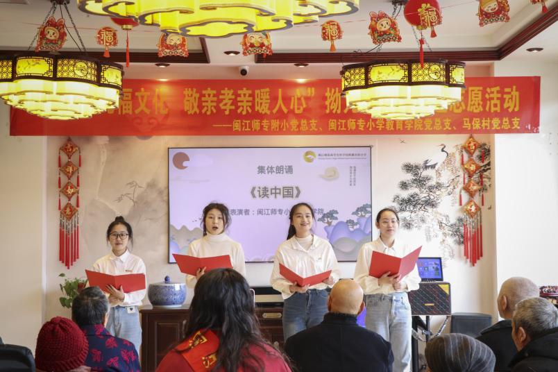 活动中,小学教育学院党总支书记和院长与老人们亲切交流,同时党员们煮拗九粥给老人送一份温暖,写书签等文创产品给老人送去一份祝福。健身气功表演、诗朗诵、独唱等文艺节目,与老人分享快乐,让他们体会到党和政府的温暖。最后,94岁老爷爷用一首《歌唱祖国》表达对党和祖国最纯粹的爱,对大家的到来感激不已,“见到你们就像见到自己的亲人一般,感谢你们”。