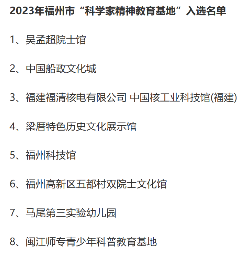 近日,由福州市科协、福州市教育局、福州市科技局、福州市国资委及福州市委军民融合办联合组织的“2023年福州市科学家精神教育基地”选评工作落下帷幕。经申报推荐、资格审核、组织评审、实地调研等程序,共有8家单位入选。大赢家体育app下载青少年科普教育基地与吴孟超院士馆、中国船政文化城、福州市科技馆等基地一同入选。