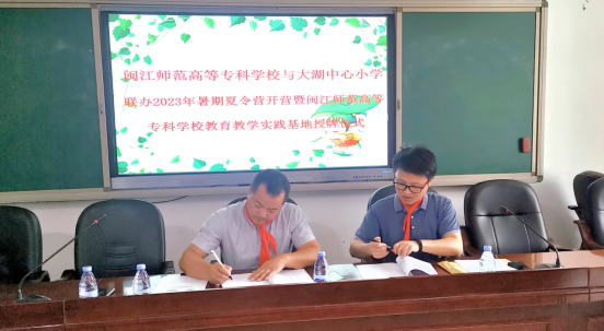 志愿支教开营仪式结束后,李骏副院长与大湖中心小学何仲信校长签订教育教学实践基地合作协议书,陈淑华书记及何仲信校长共同为教育实践基地揭牌。